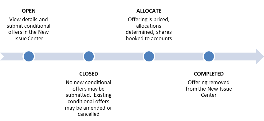When E*TRADE makes an offering available to its customers, that offering progresses through several stage, beginning with the "open" stage, when the offering first becomes available on etrade-rsi.com and is open to customer participation, to the "completed" stage, after all allocations have been made and the offering is removed from the site.