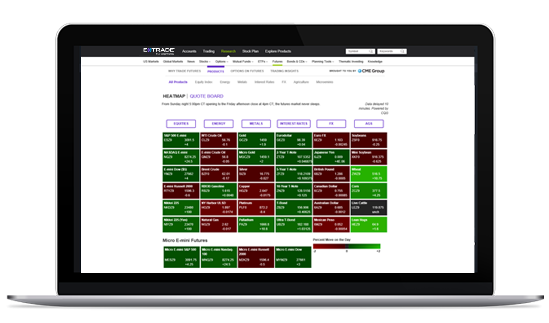 E*TRADE offers over 60 futures contracts to trade, including market indices, energies, metals, interest rates, currencies, and cryptocurrency futures.