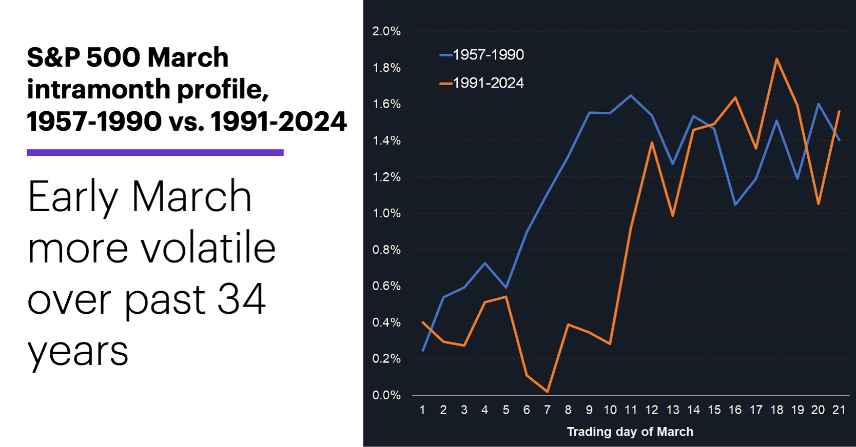 Historically, there’s been some consistency in the SPX’s typical trajectory in March. The following chart shows the SPX’s intramonth profiles—its median net return as the month progresses—for two periods, 1957-1990 (blue) and 1991-2024 (orange):1